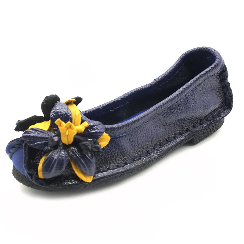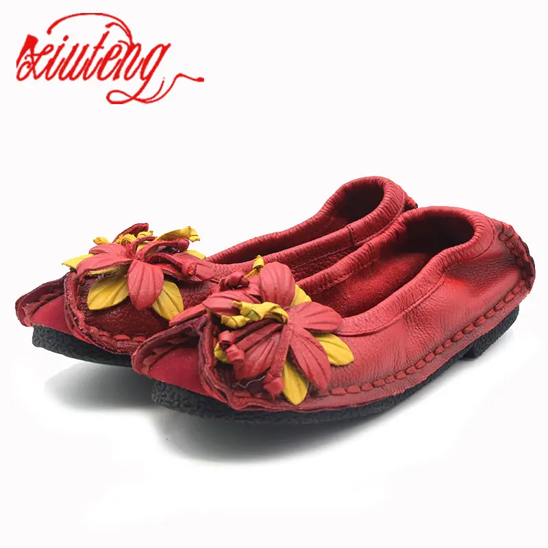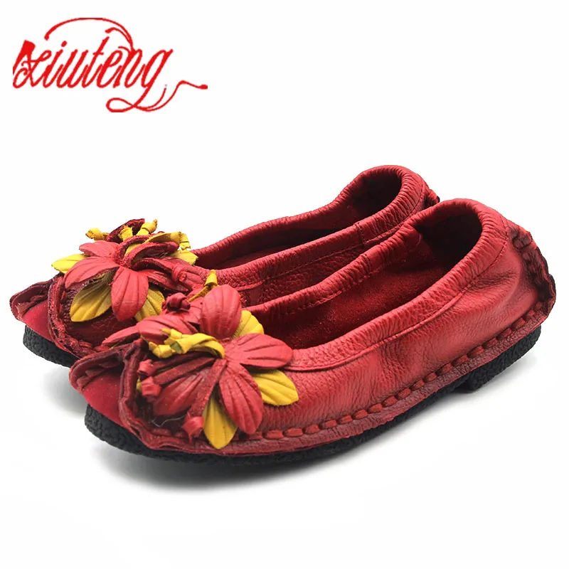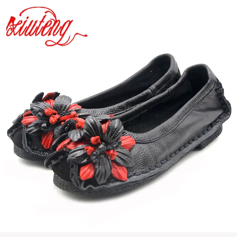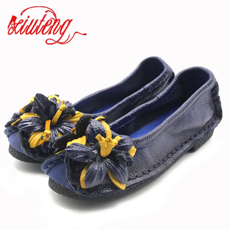 Xiuteng Genuine Leather Women Shoes Casual Flower Single Flat Round Toe Style Boat Shoes Soft Comfortable Women Flats 2018 New