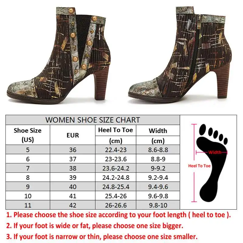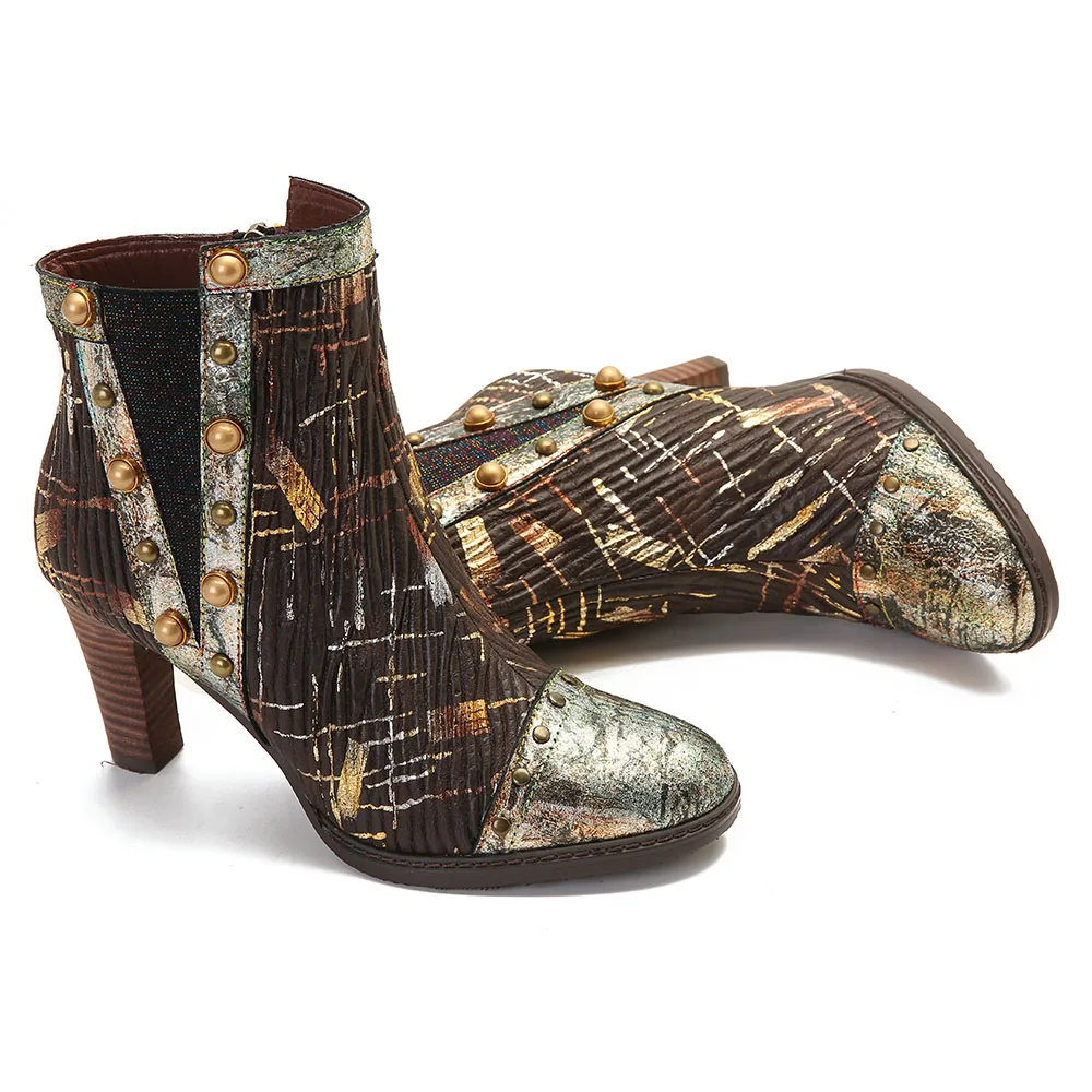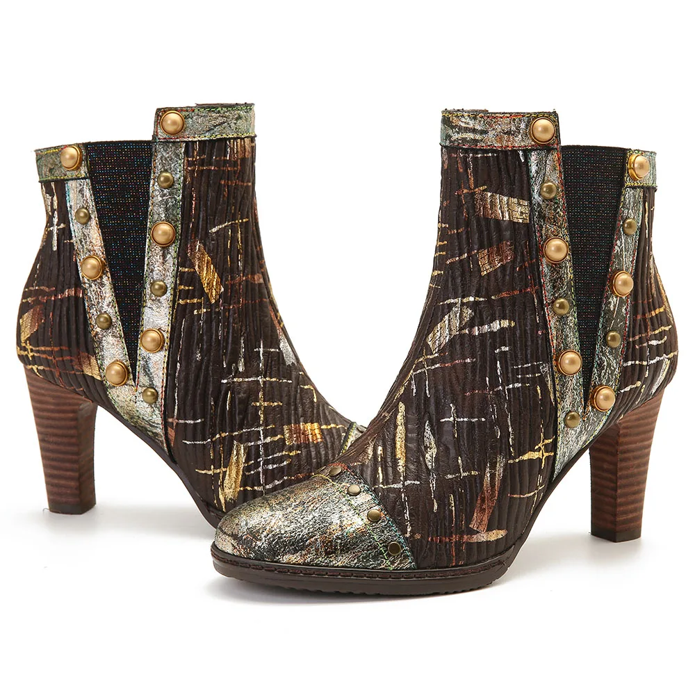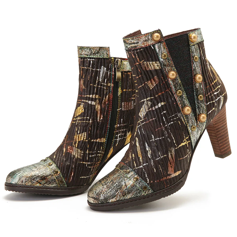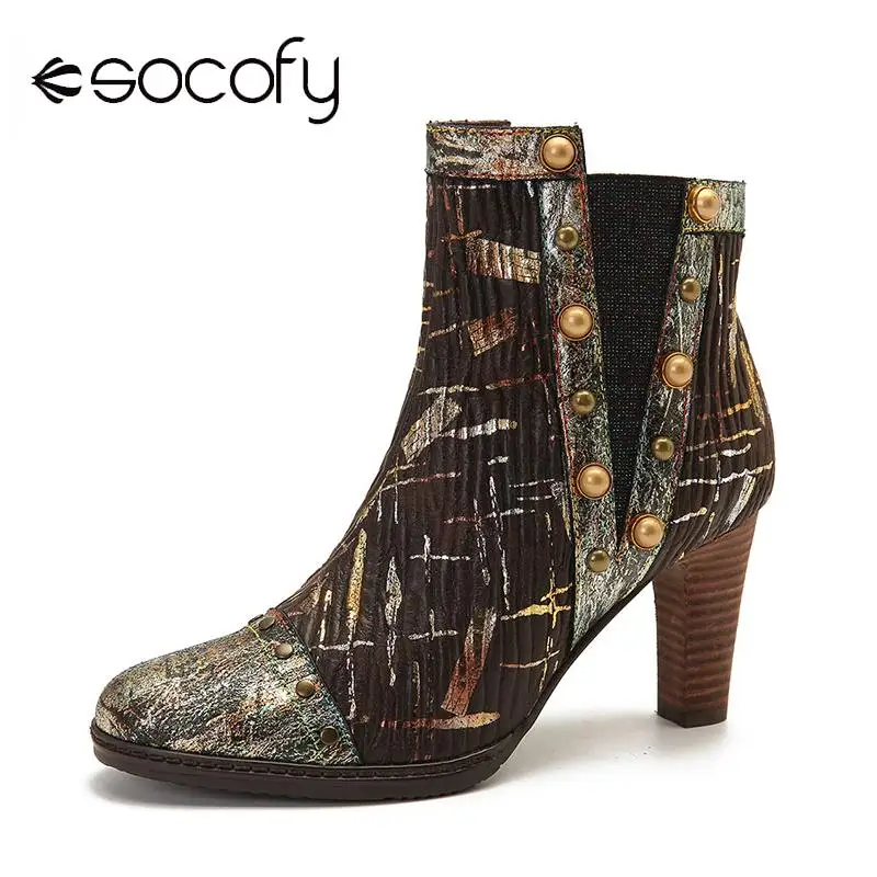 Socofy Retro Colorful Boots Pattern Genuine Leather Gorgeous High Square Heel Zipper Boots Botas Mujer Elegant Shoes Women